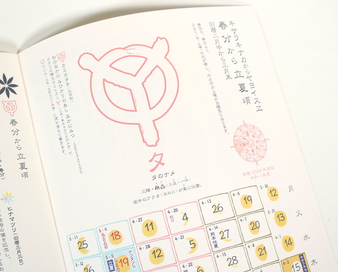 2026年度版は、2025年12月15日(旧暦シモツキナカ・冬至満月)より2027年1月2日まで、閏ミナツキ(旧暦閏6月)が入る1年13ヶ月の暦です。