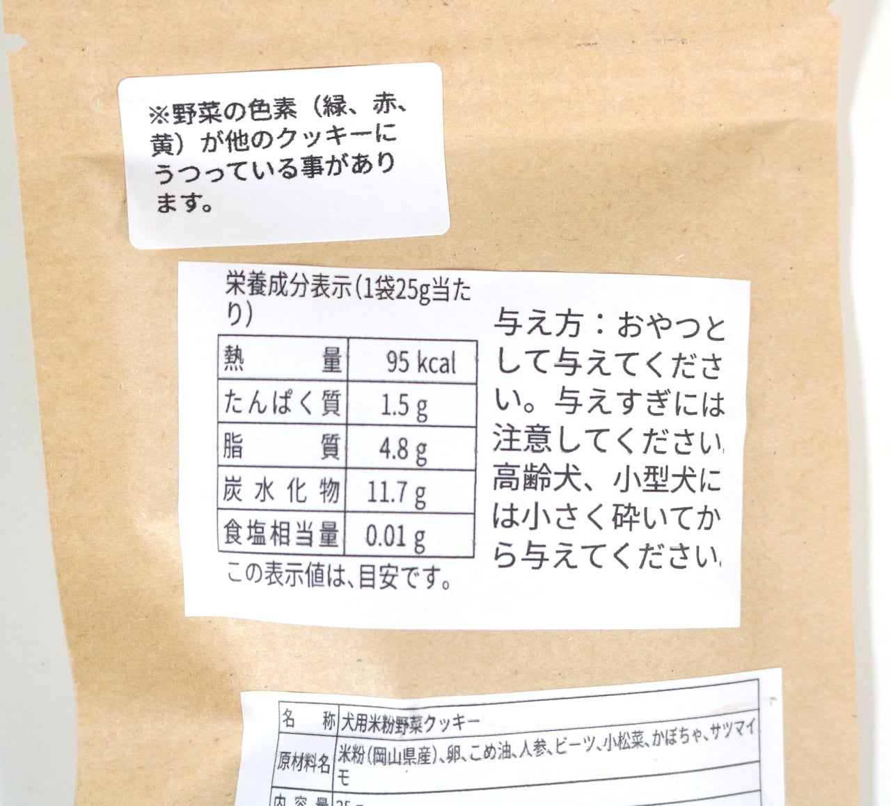 原材料名 米粉(岡山県産)卵、こめ油、人参、ビーツ、小松菜、かぼちゃ、サツマイモ