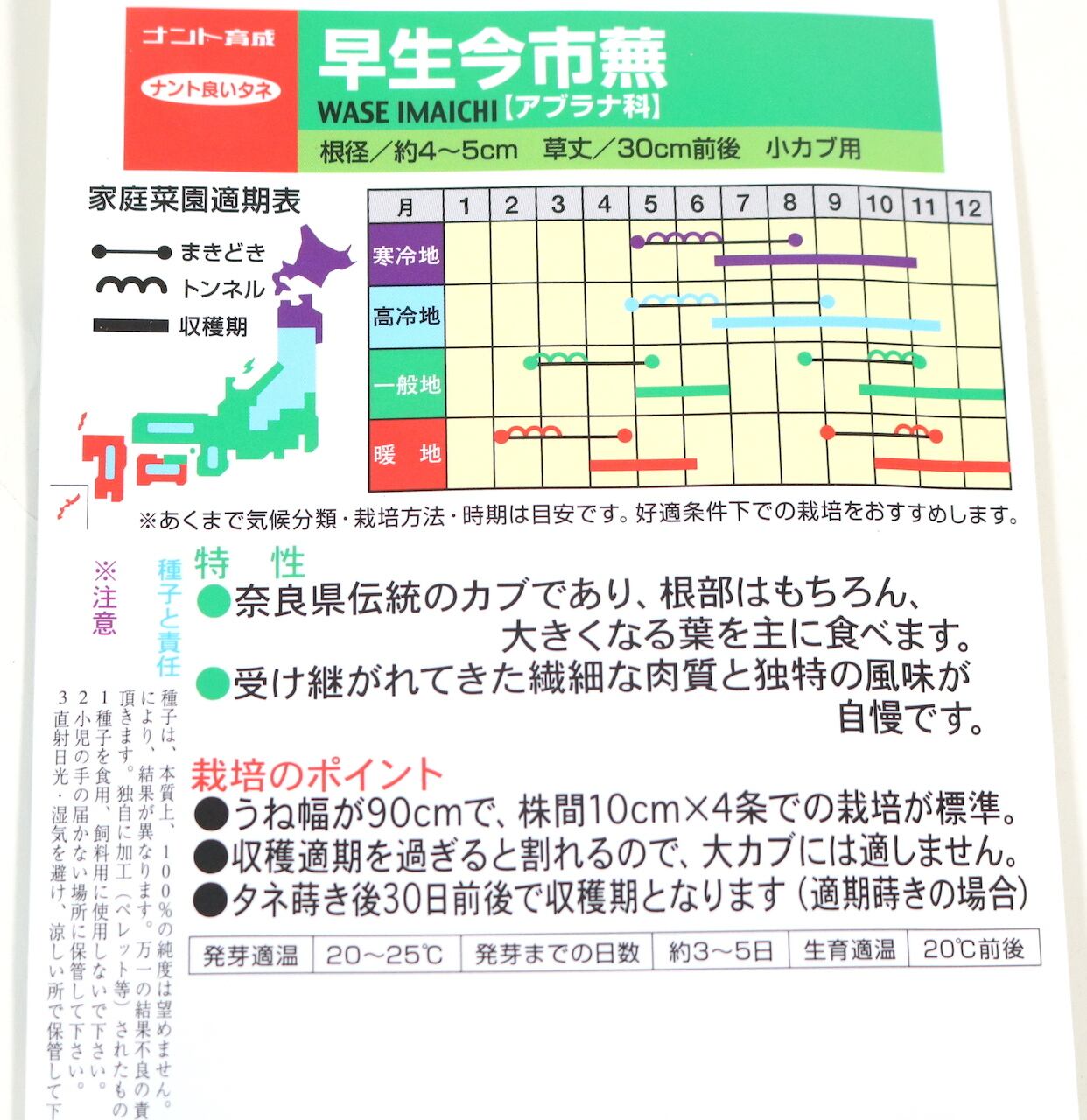 奈良県伝統のカブであり、根部はもちろん、大きくなる葉を主に食べます。受け継がれてきた繊細な肉質と独特の風味が自慢です。根径約4~5cm、草丈30cm前後。小カブ用。