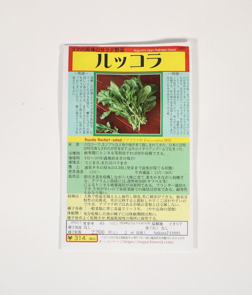 特徴 アブラナ科。野生種や従来品種より癖がなく食べやすいサカタ改良オデッセイ種。ルッコラはイタリア語。ラテン語の旧名がエルーカ。イタリアンクレスということもある。英名はロケットサラダ。またはガーデンロケット。背の低い一、二年草で、地際からよく分枝する葉を摘み取ったり、株元から抜いて収穫する。