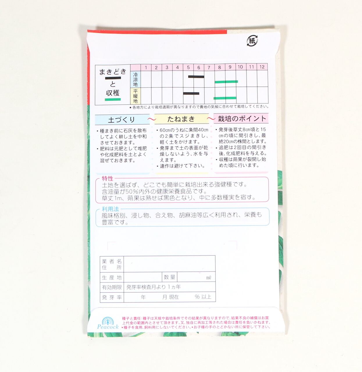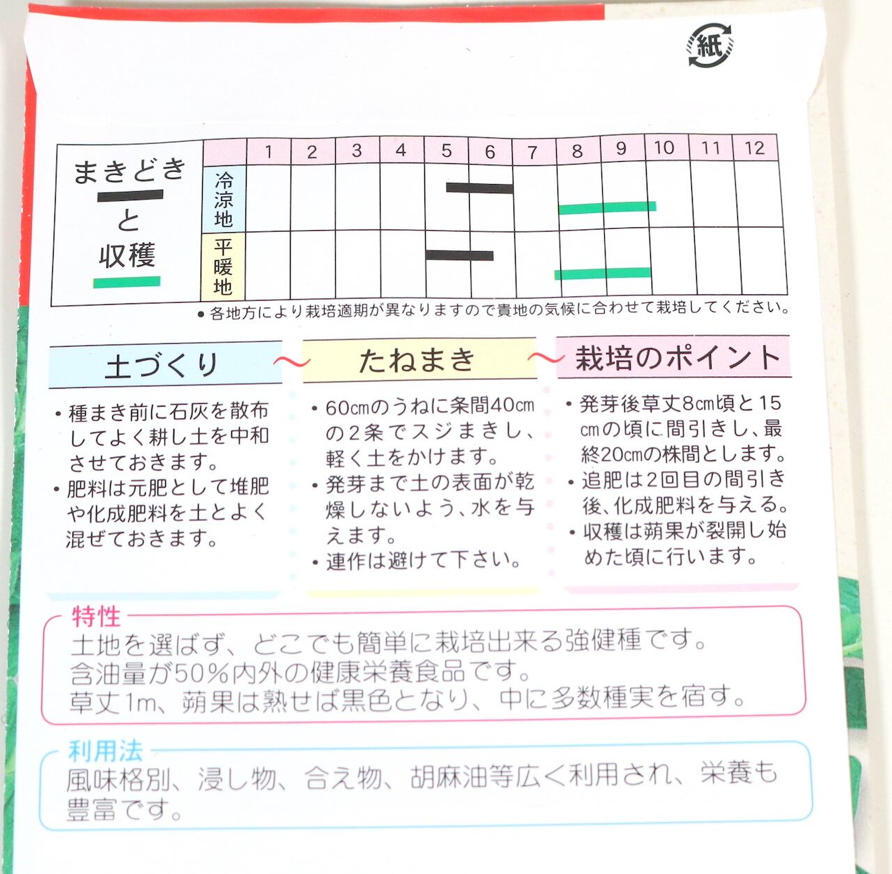 土地を選ばず、どこでも栽培できる強健種です。含油量が50%内外の健康食品です。草丈1m、朔果は熟せば黒色となり、中に多数種実を宿す。