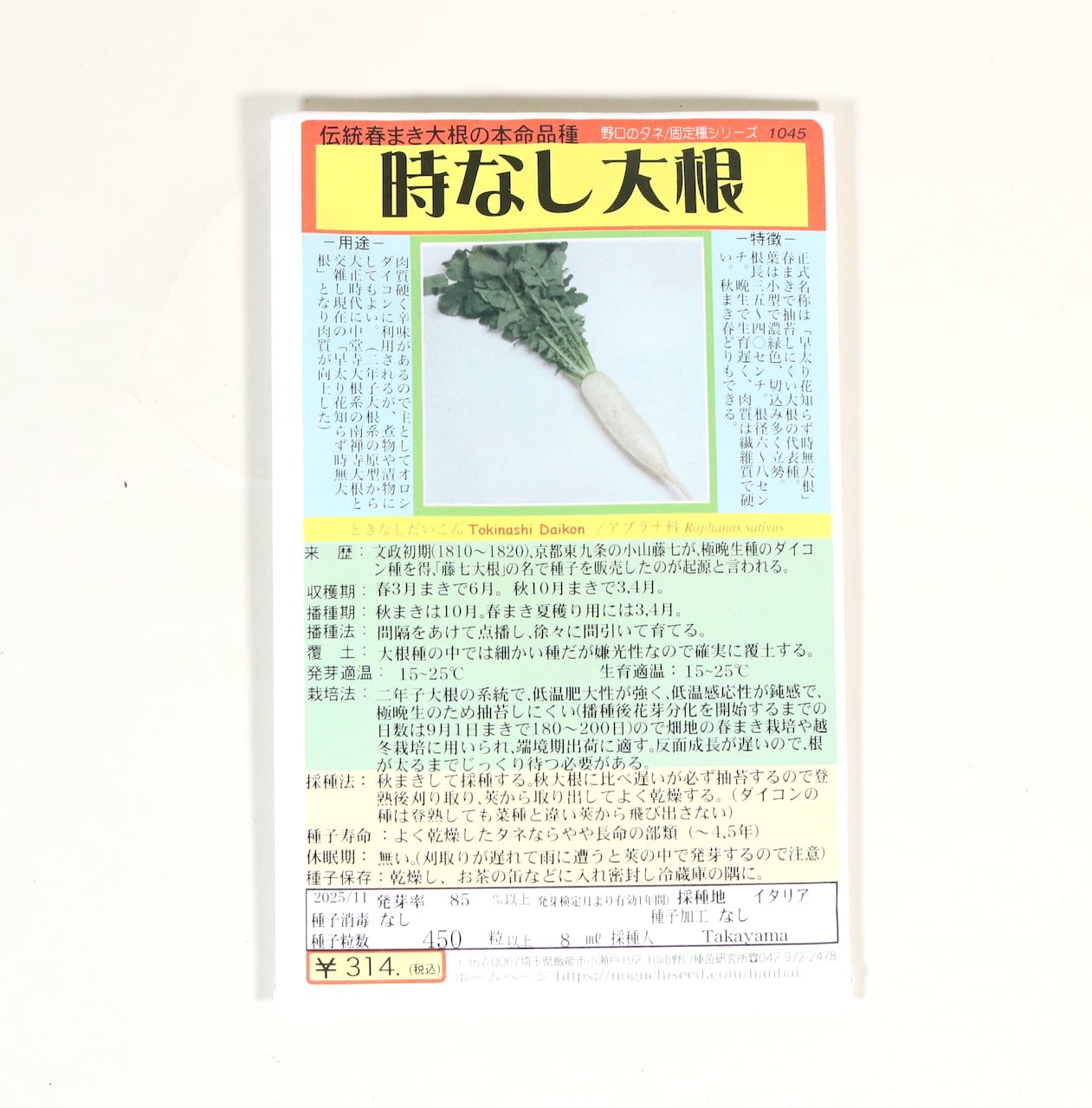 正式名称は「早太り花知らず時無大根」 春まきで抽苔しにくい大根の代表種。葉は小型で濃緑色、切込み多く立勢。根長35~40センチ。根径6~8センチ。晩生で生育遅く、肉質は繊維質で硬い。秋まき春どりもできる。