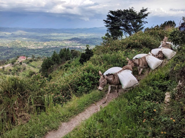 標高が高すぎて、集荷するトラックが入れないため、小農家さんたちがいつも使っている「ロバ」(ドンキー)にコーヒーチェリーを載せて山をくだり水洗工場まで運んでもらっています。